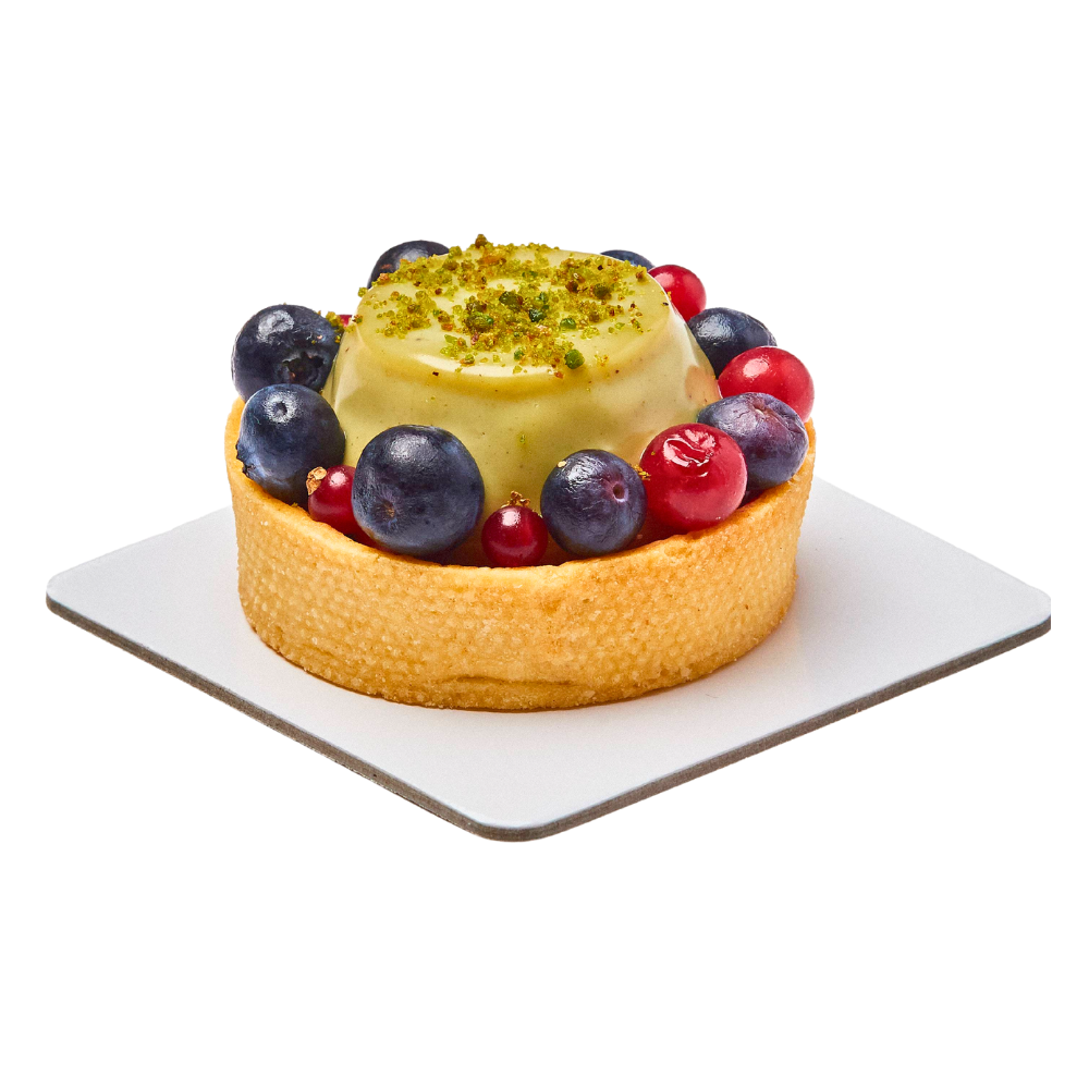 Ingrediente: FRIȘCĂ, FĂINĂ albă de GRÂU, CIOCOLATĂ albă cu LAPTE, LAPTE, OUĂ, UNT, zahăr, pastă de FISTIC, FULGI CROCANȚI (zahăr, UNT, FĂINĂ albă DE GRÂU), FĂINĂ DE MIGDALE, ulei, gelatină, glucoză, lămâie, pectină, sare, fructe pentru decor.