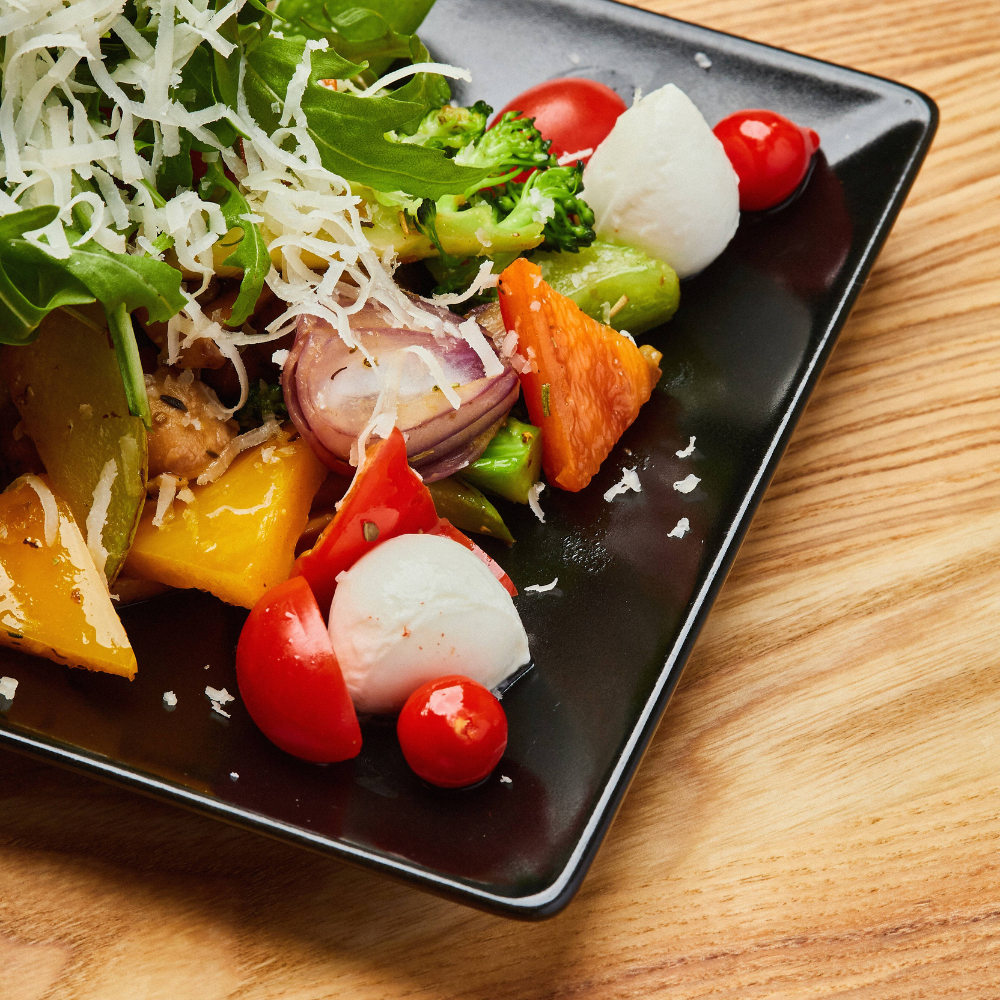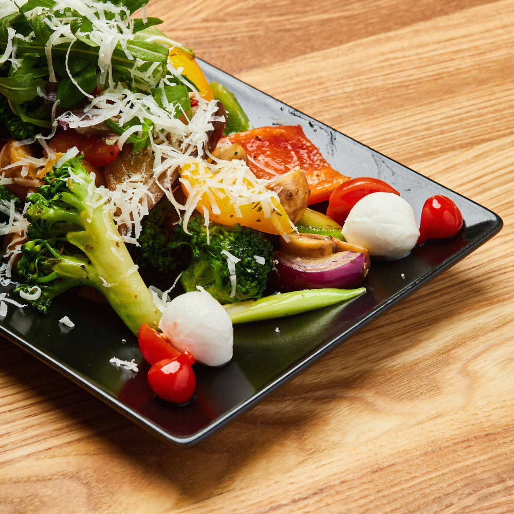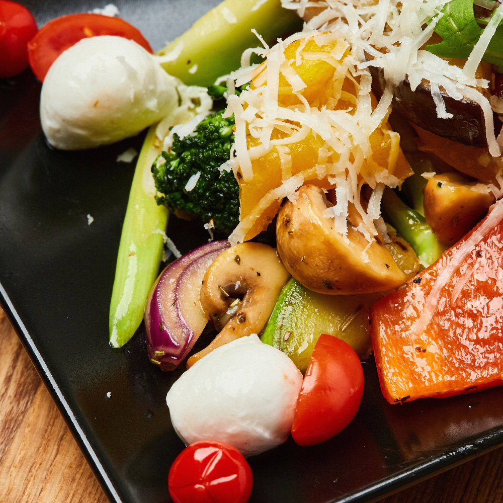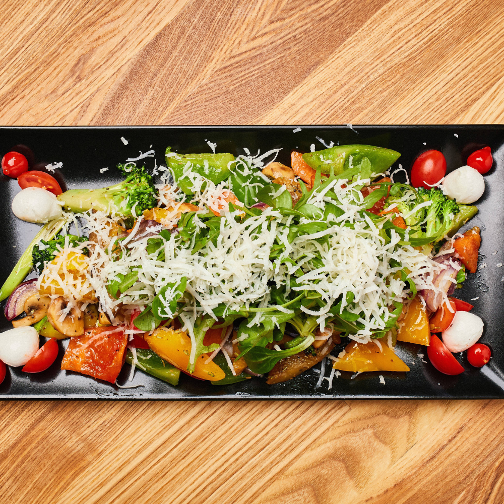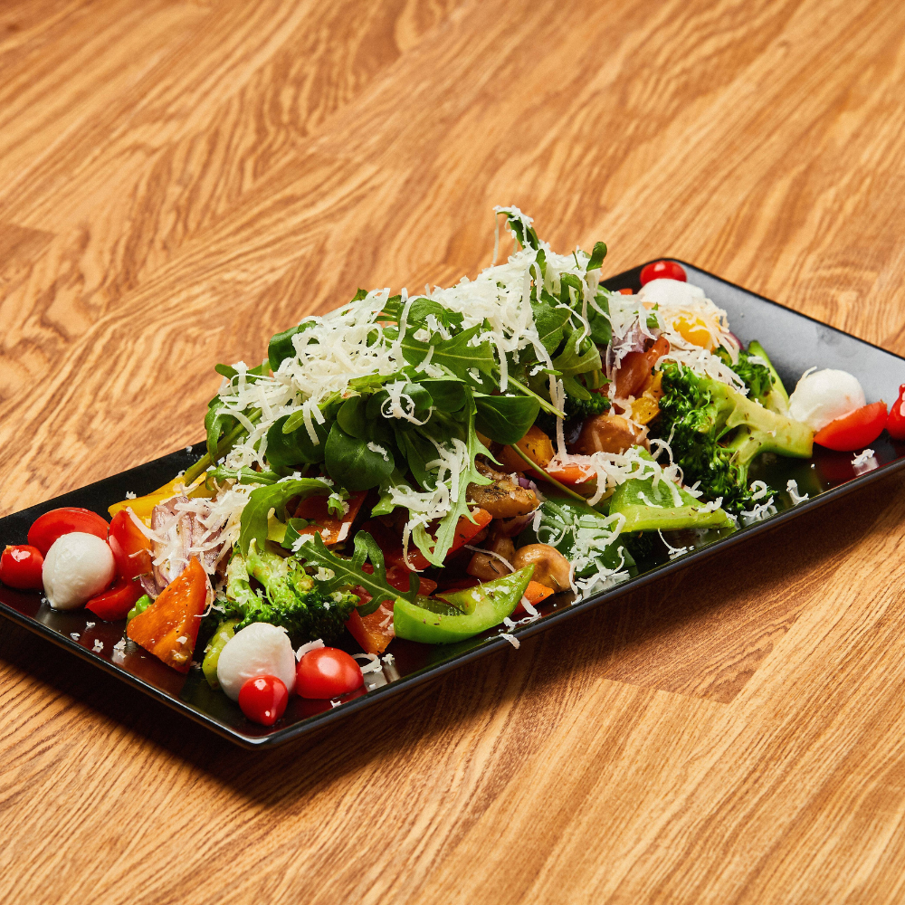 Ciuperci, dovlecei, vinete, mix de ardei, fasole verde, ceapă roșie, roșii cherry și fenicul toate sotate în ulei de măsline cu puțin usturoi confiat mărgele de mozzarella acoperite cu rucola și vinaigrete mediteranean.